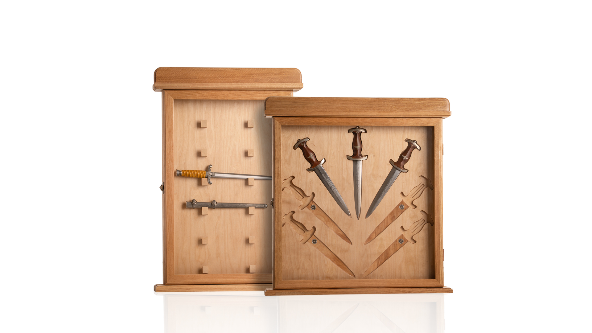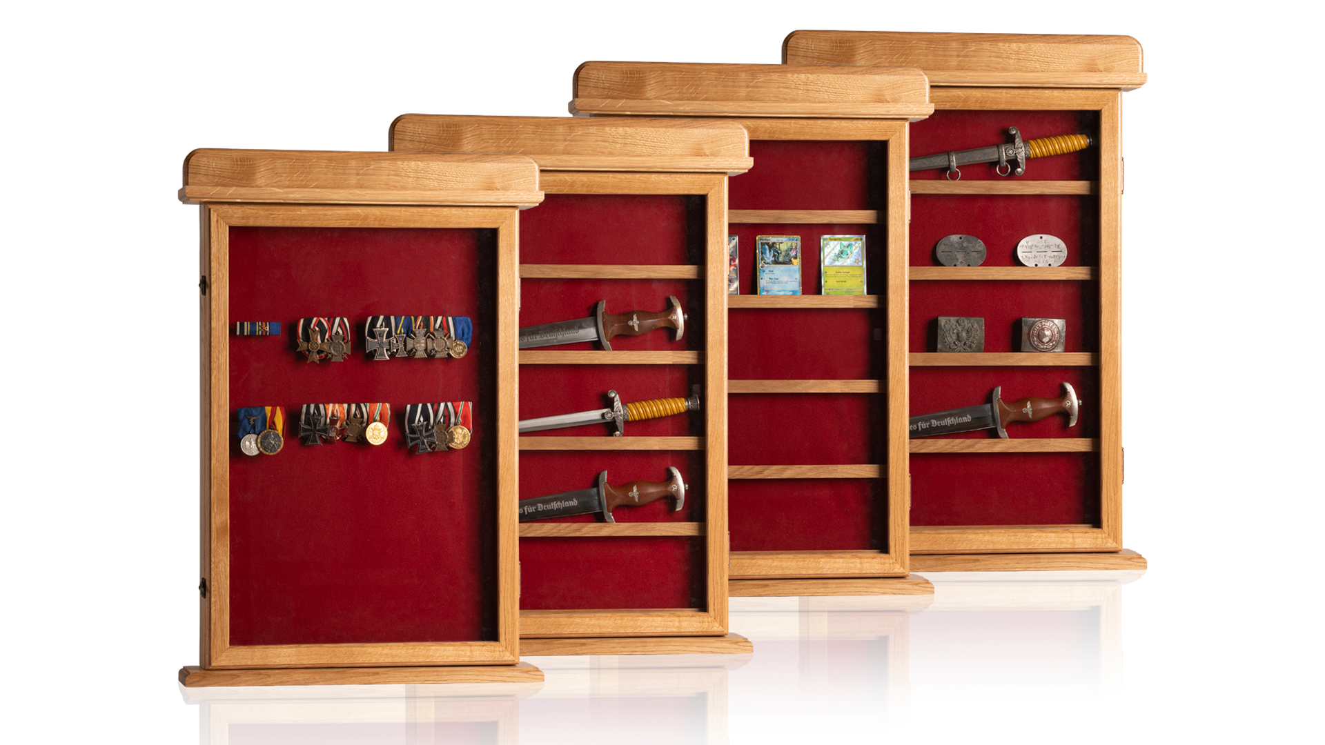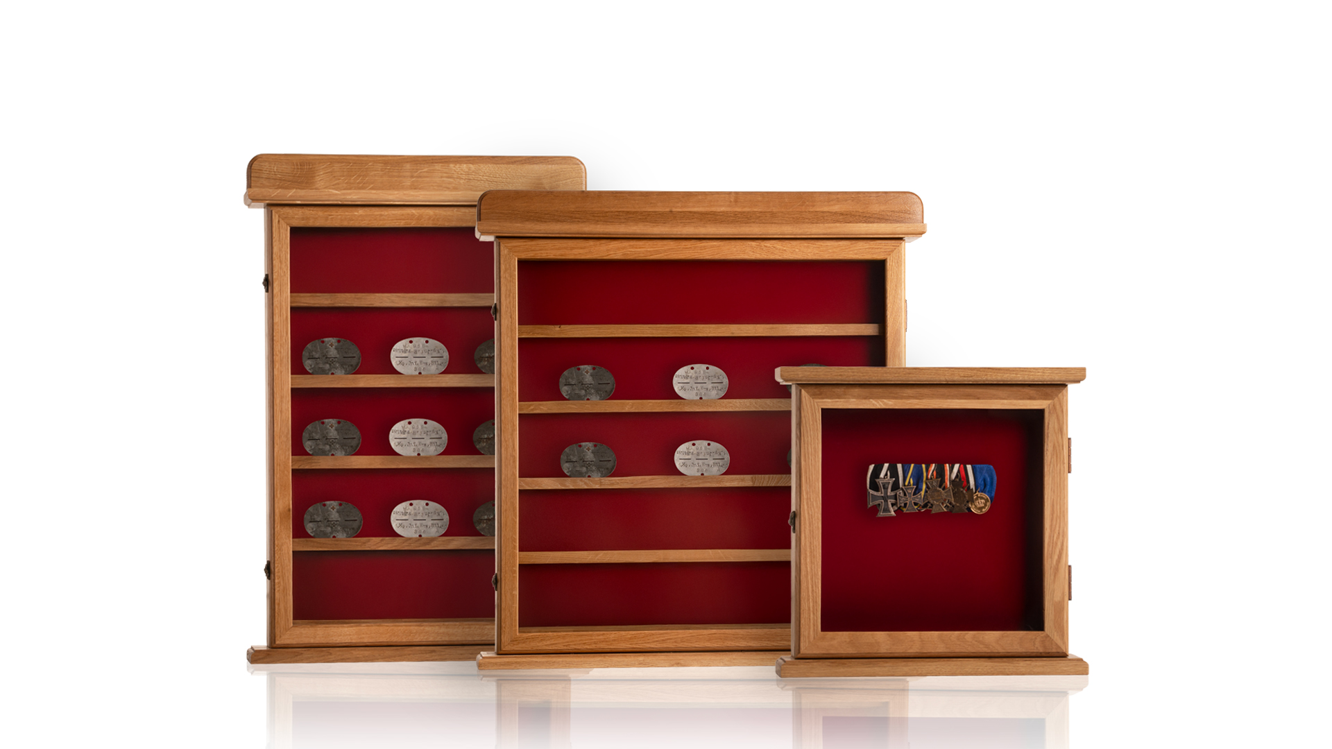 Masivní dubová prachotěsná vitrína na cokoli od řádů a odznaků po kartičky nebo vojenské předměty.